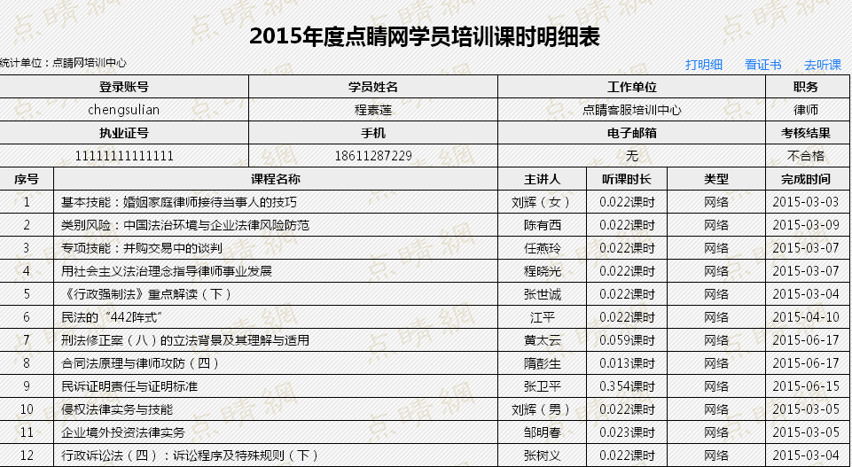 四、学员如何查看课时 1.律师如何查看课时 1.1 学员登录进入到个人后台页面,点击网页左侧“进度统计”,页面显示您是否合格,可实时查看学习进度。如下图: ![]() 1.2 如果您完成了所要求课时会显示“合格”,需要听课证明,请点击“打证书”。如下图: