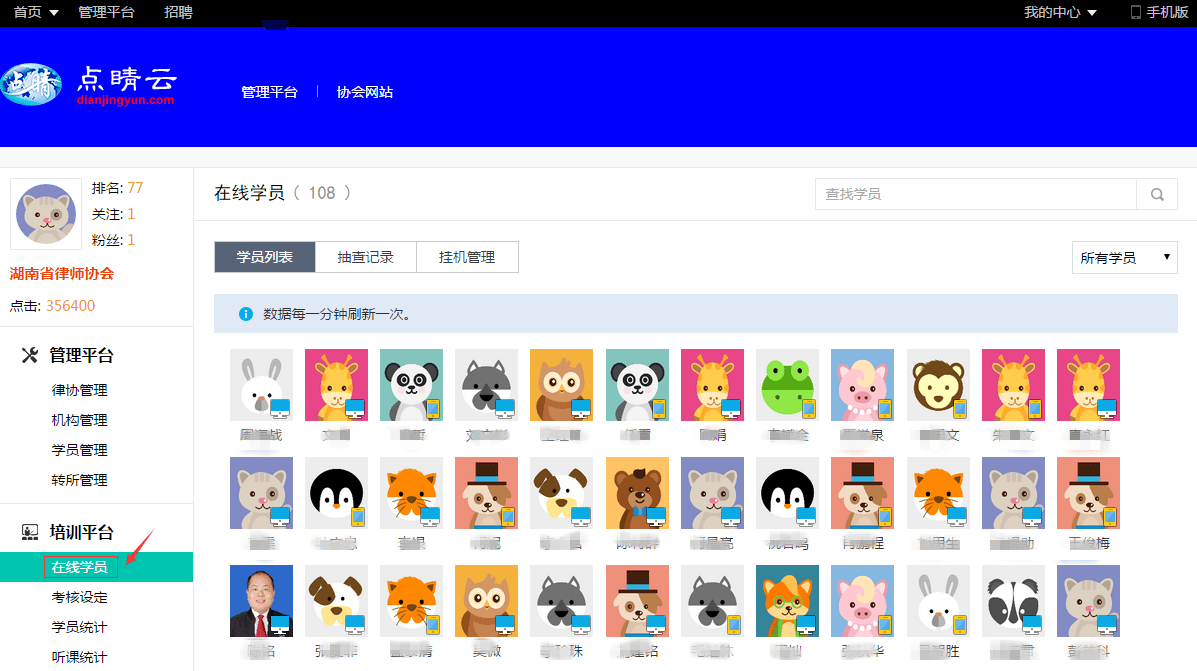 1.3请根据需求查看并打印听课明细,如您需要明细,请点击“看明细”。如下图: ![]() 2.律协和律所如何查看课时 2.1管理人员用管理账号和密码登录点睛网,进入管理平台页面。页面显示该协会或律所的“培训信息”。如下图: