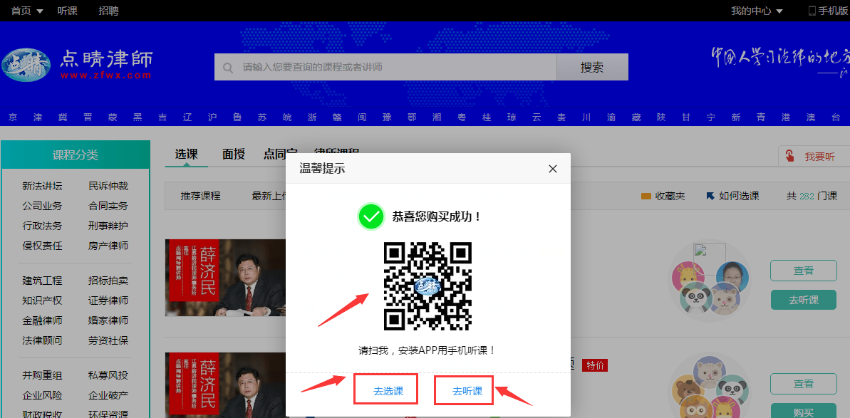 5. 确定购买后,您可以继续选课,也可以去听课。也可以扫二维码安装APP用手机和平板听课。如下图: